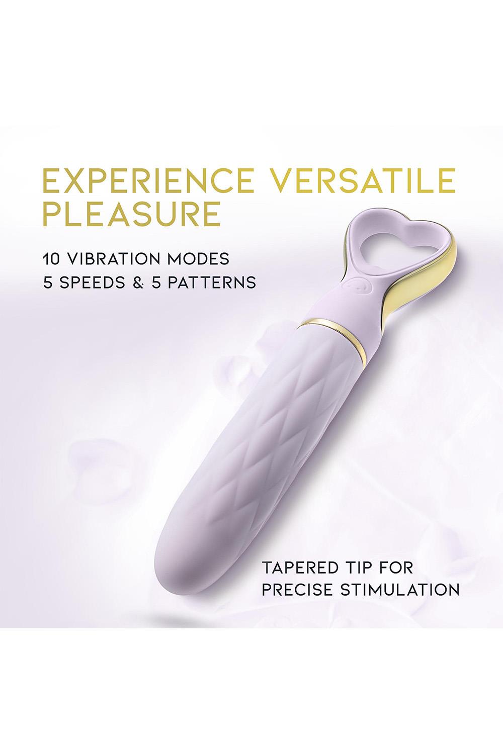 Slatki, šik i sofisticirani, Delice Heartthrob je vibrator dizajniran da razmazi vaša čula. Njegov glatki, suženi vrh pruža ciljanu, preciznu stimulaciju, sa 10 raznovrsnih režima vibracije - uključujući 5 brzina i 5 obrazaca - kako biste istražili svoje zadovoljstvo, sve na dohvat ruke. Napravljen od vrhunskog, platinasto očvrslog silikona Puria®, bezbednog za telo, sa luksuznom UltraSilk® završnom obradom, Heartthrob je neodoljivo mekan i nežan na koži. Drška u obliku srca, ukrašena zlatom, dodaje dašak elegancije vašem vremenu za igru. Otporan na prskanje i magnetni USB punjiv, ovaj vibrator osigurava da je vaše zadovoljstvo uvek nadohvat ruke. Punjenje se preporučuje preko laptopa. Prelepo dizajniran za samostalno uživanje ili kao pažljiv poklon, lagani i spremni za putovanja, Heartthrob je savršen pratilac gde god da vas strast odvede. Preporučujemo upotrebu lubrikanta na vodenoj bazi. Ukupna dužina proizvoda je 14cm, a dužina za umetanje je 8.3cm. Širina iznosi 2.3cm.